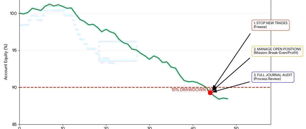 When your total trading equity—your current account value, including all floating P&L—drops by 10% from its last peak, you must transition instantly from an active trader to a Chief Risk Officer performing mandatory damage control. The first action is an immediate freeze on all new trade entries. This prevents the bleeding from worsening and ensures you don't take on any new, unmanaged risk while you are in a psychologically compromised state.